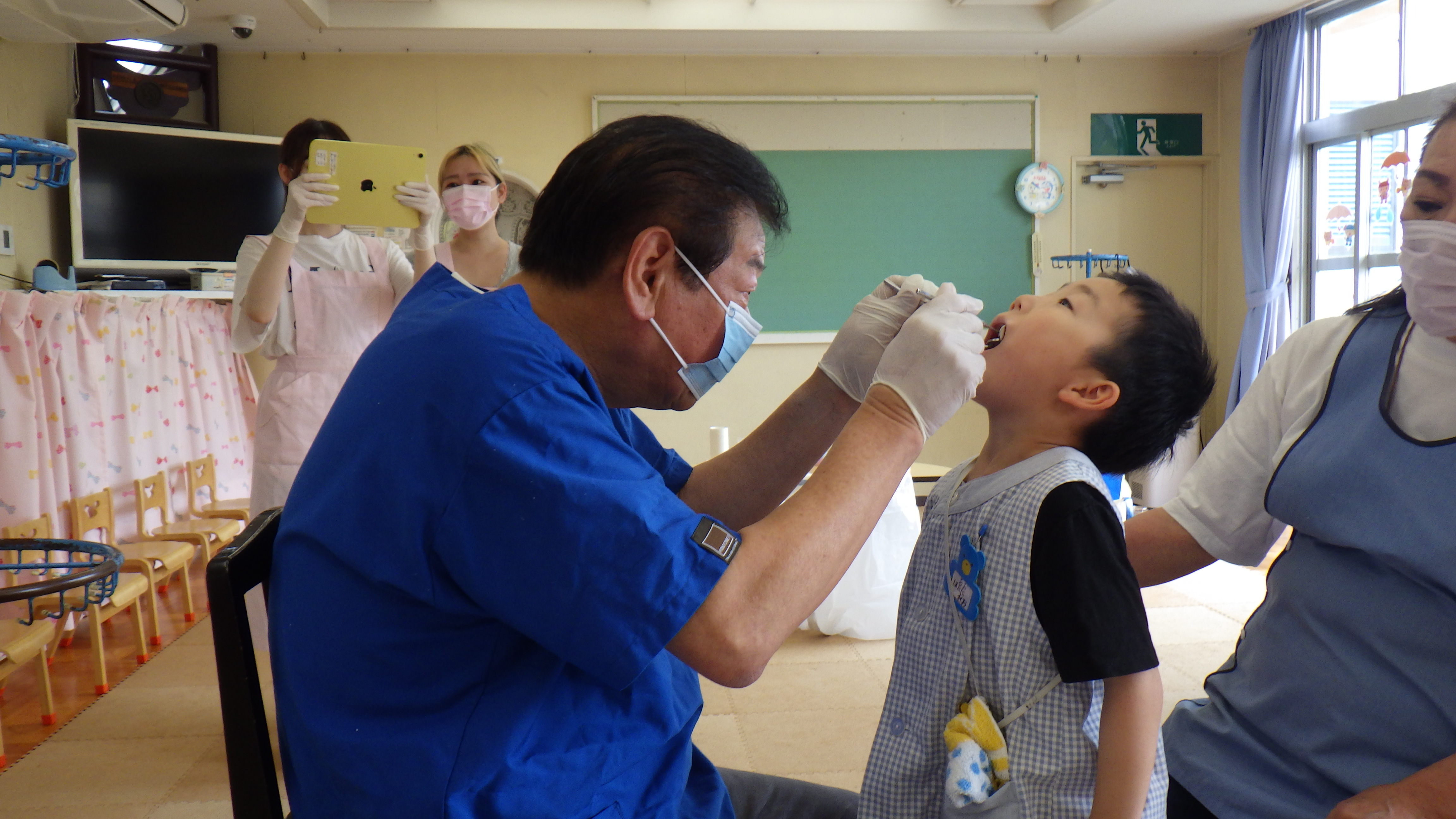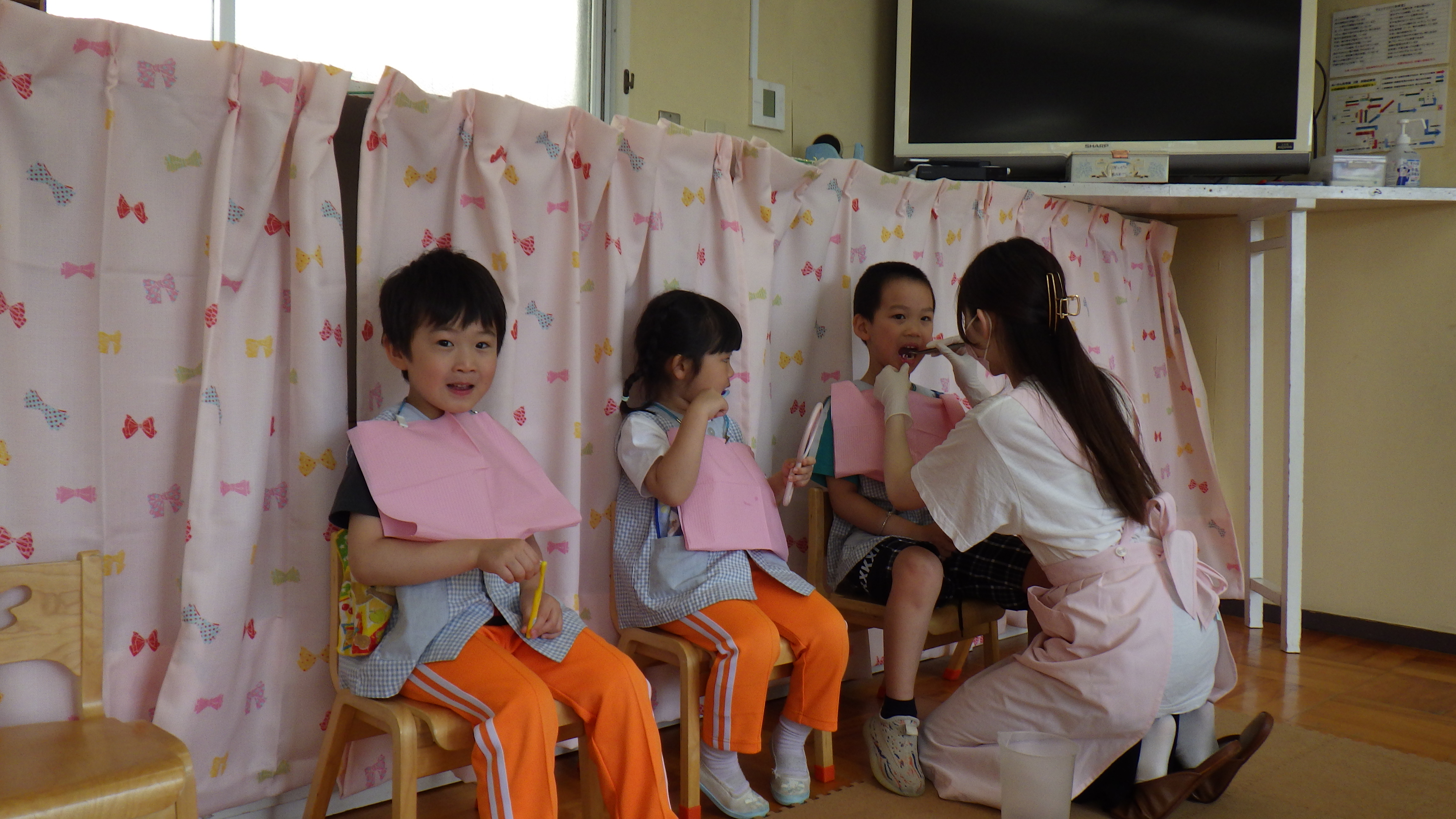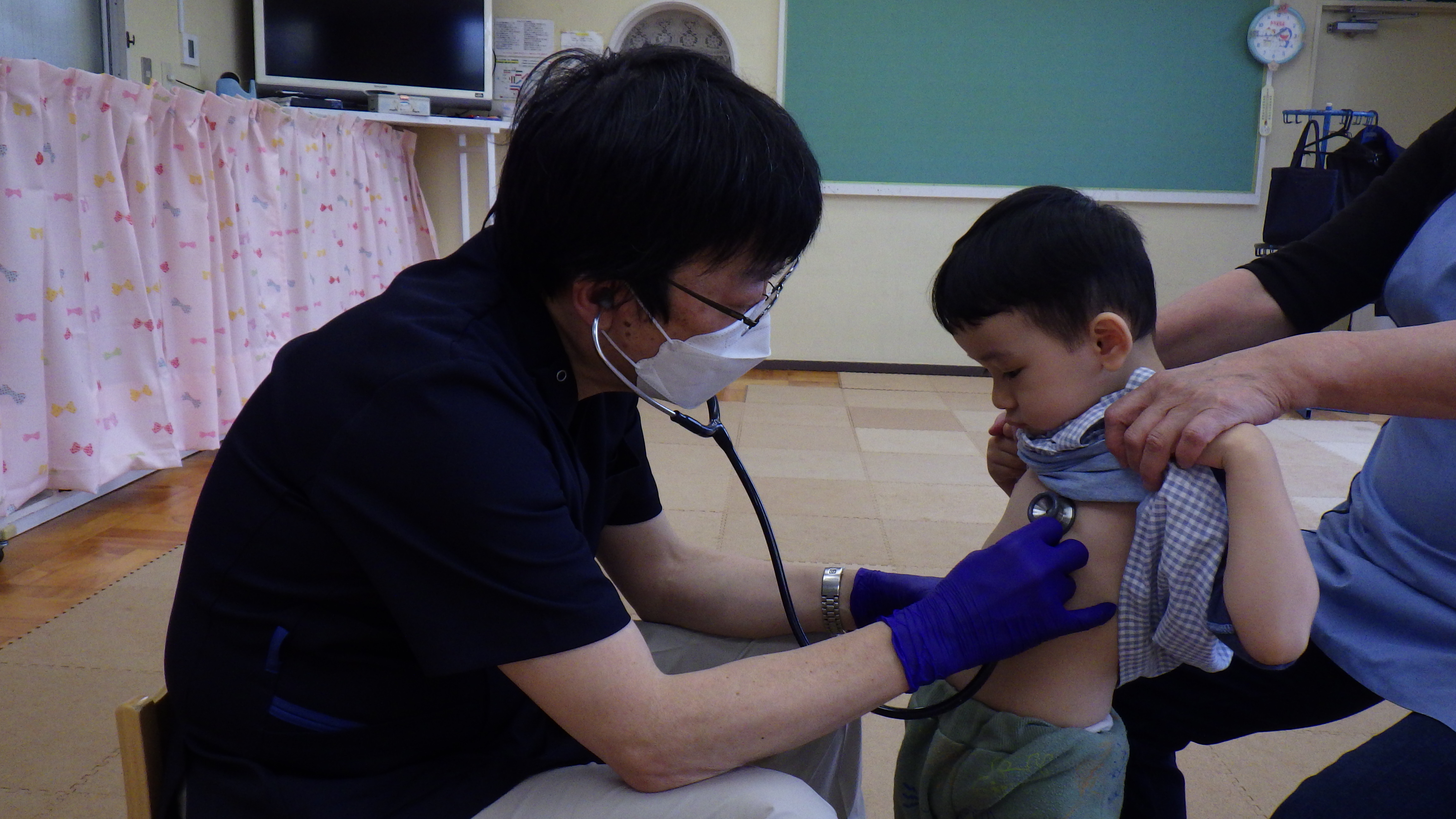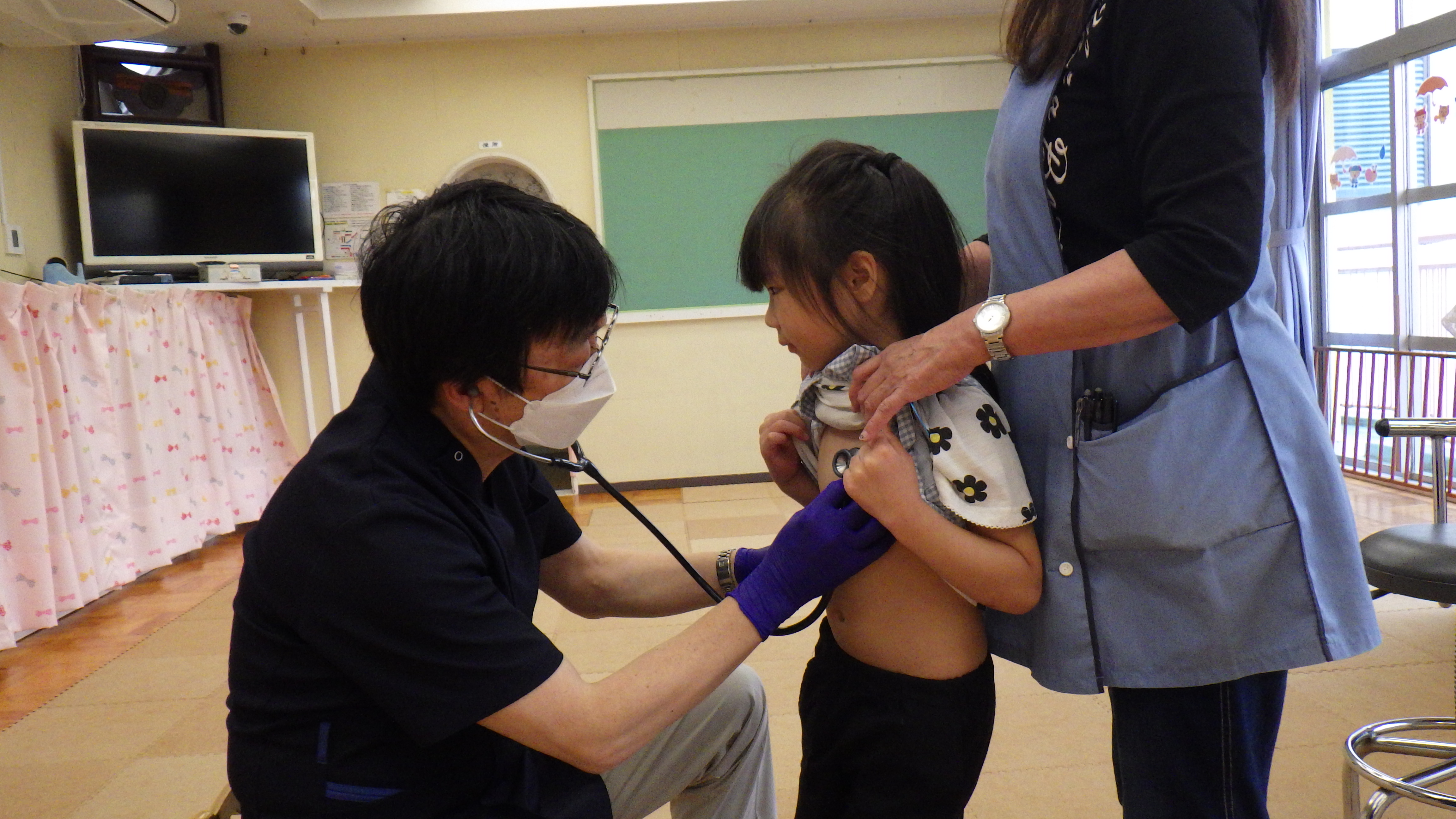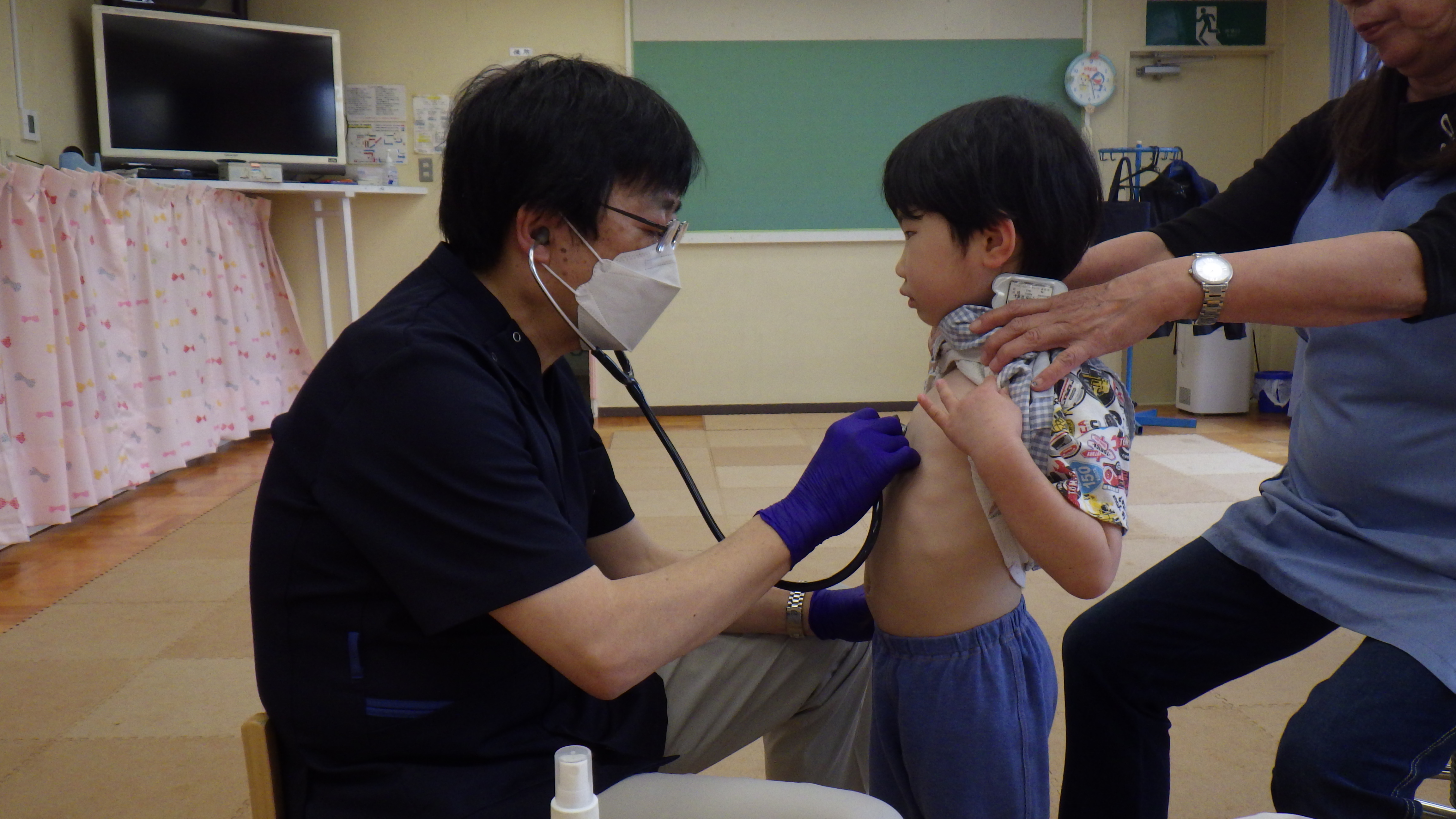 今日は、午後から嘱託医の田路医院長に来て頂き、全園児の内科検診が行われました。桃組、ベビー組は午睡中に検診をしましたが、目覚めても泣き出す子もいなくて、先生に「バイバイ」「タッチ!」と挨拶もしていました。赤〜青組の園児もきちんとご挨拶をして、検診を受けました。