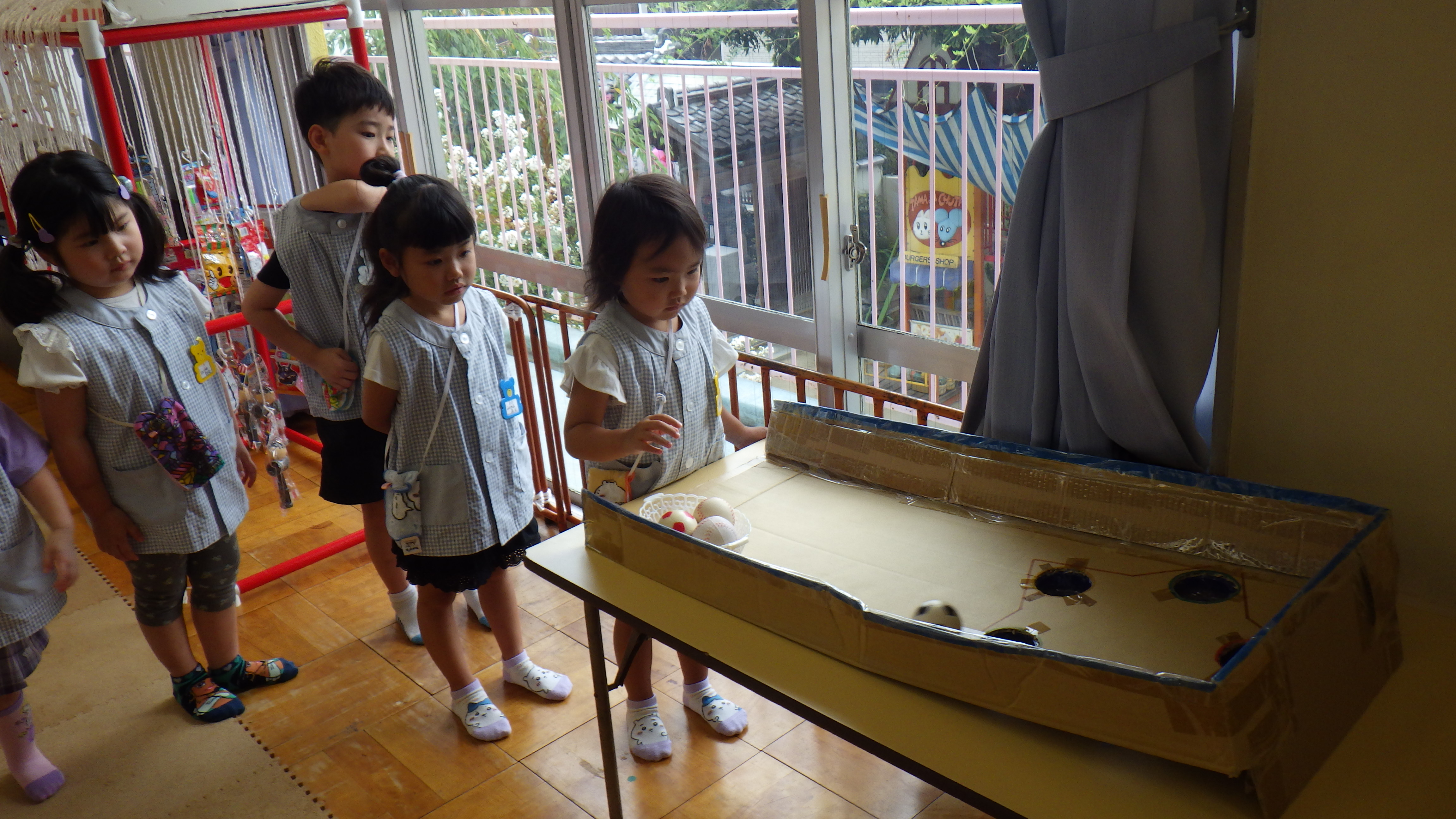 今日は、青〜赤組のみんなで、「地蔵盆子ども祭り会」を楽しみました。初めに、隣のお寺のお地蔵様にお参りをして、2階のホールで、当て物・スーパーボールすくい・輪投げ・スマートボール・千本釣り等をしました。