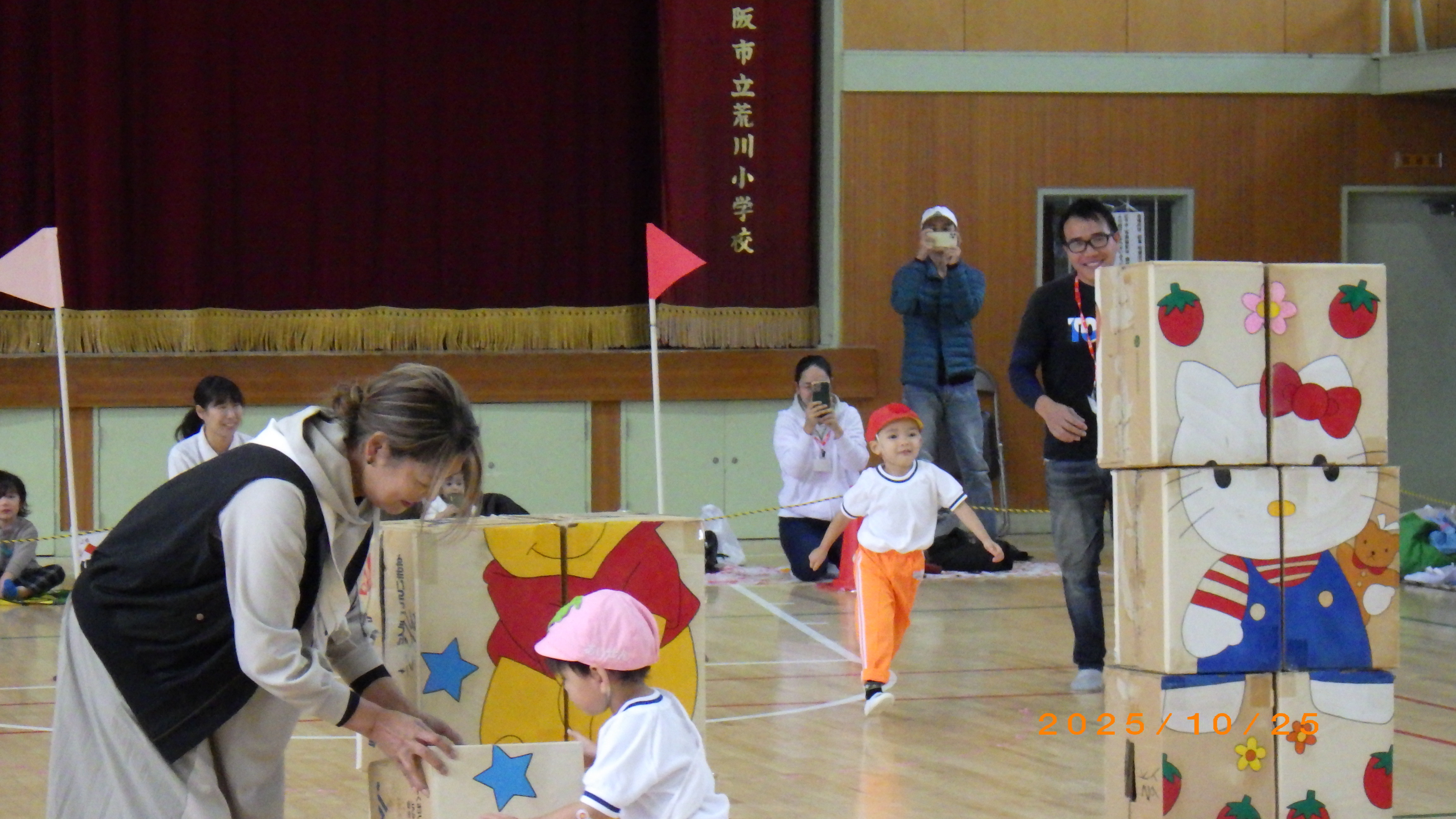 今年も荒川小学校の体育館をお借りして運動会を開催致しました。ご家族の参加人数の制限がありましたが、沢山の方にご参加いただき、欠席児もなく、楽しい運動会となりました。今年は、当園の卒園児の中学生達にもお手伝いして頂きました。ご家族の楽しい思い出作りが出来た事と、職員一同、嬉しく思います。