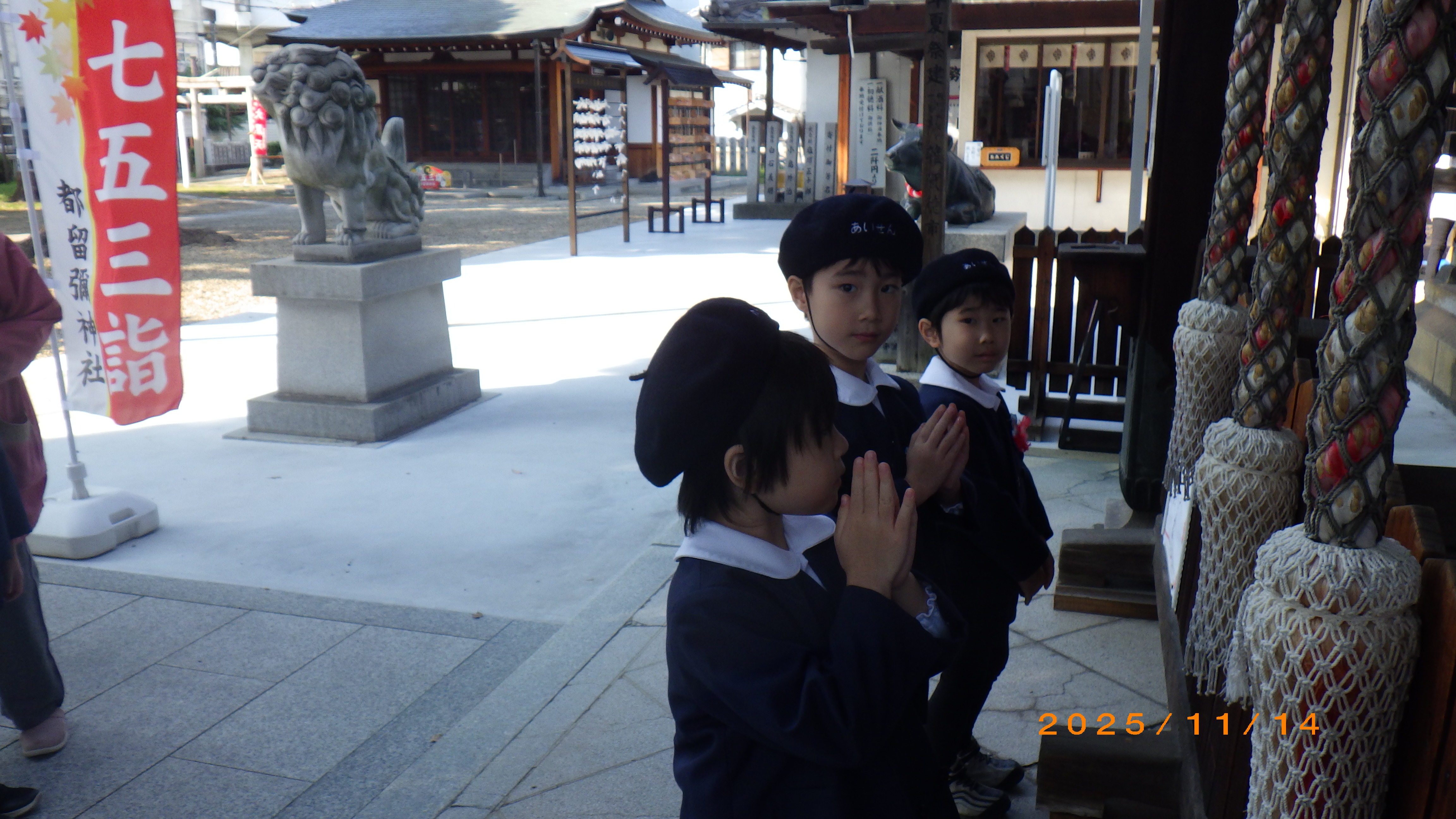 晴天に恵まれた今日は、青組〜桃組の園児たちは、手を繋いで歩いて都留弥神社へ行き、「七五三詣り」をしました。